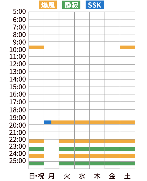 土・日・祝: 9:00 / 11:00 / 23:00