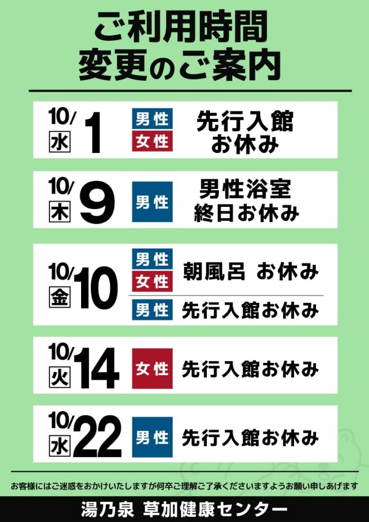 10月 ご利用時間変更日のお知らせ