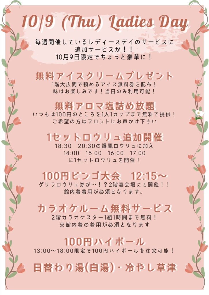 10月9日(木)の「レディースサービスDAY」はちょっと豪華!