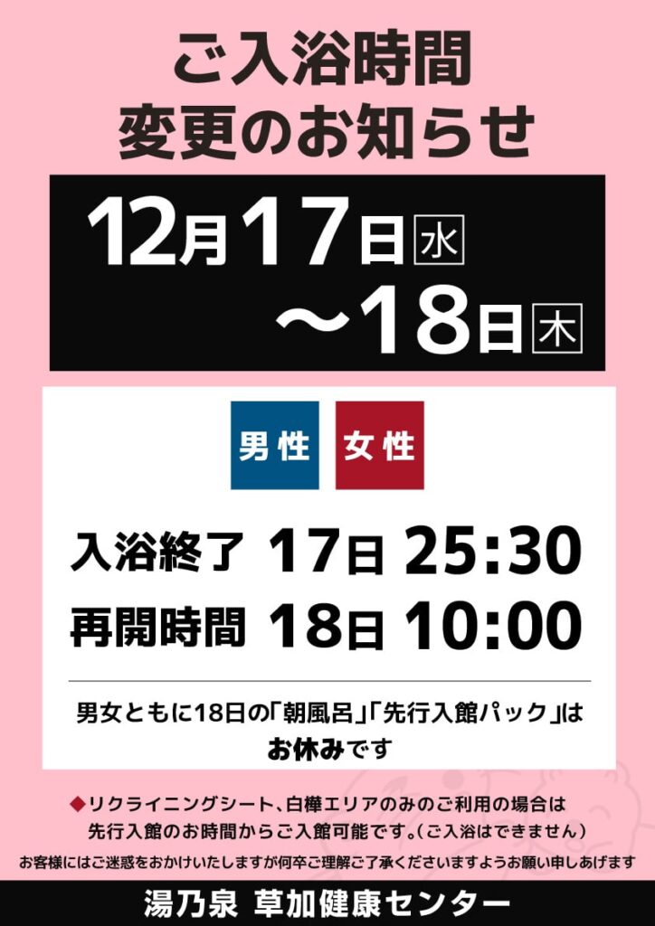 12月17日(水)~18日(木) 男女浴室のご利用時間が変更となります。