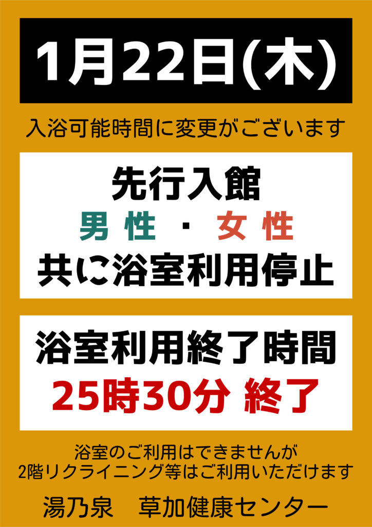 メンテナンスの為、男女共に先行入館お休み、25:30にて入浴終了となります。