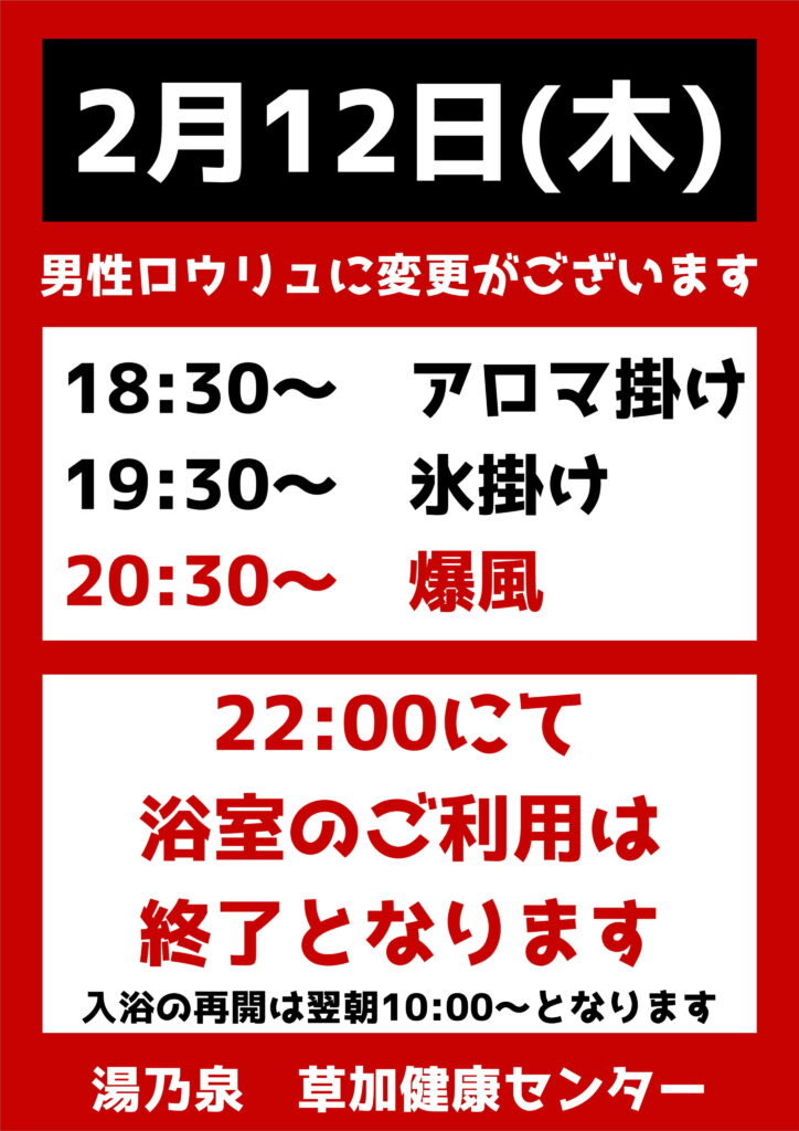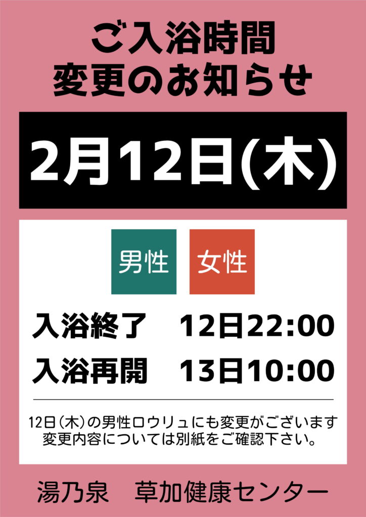 2月12日(木) 男性・女性とも入浴時間を変更いたします。