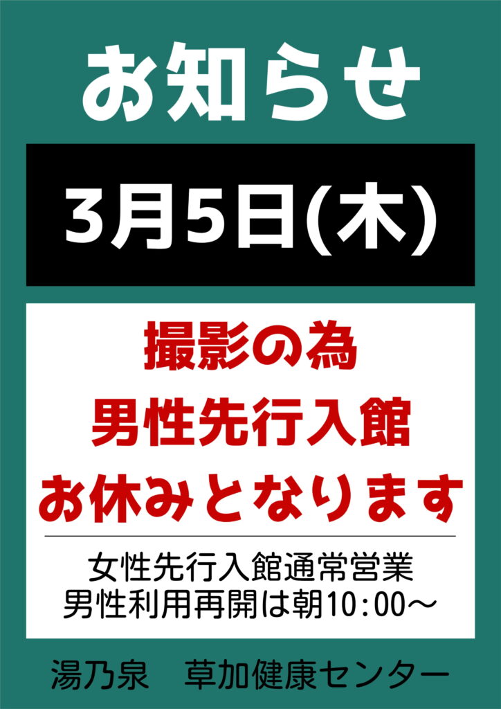 3月5日(木) 男性「先行入館パック」お休みのお知らせ